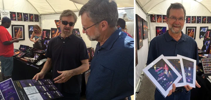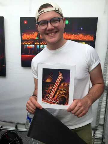 When I started painting Chicago by night, I was really just satisfying my own aesthetic. I have always loved the way the night treats all the nooks and crannies of the city, the diners, the bars, the theaters, the joints, etc. When I started making prints of my paintings available to the public, I soon realize that all the places I was painting not only had their own histories but also the personal histories of the people who have inhabited them over the years. I have decided to start relating some of those personal stories from the people I meet at the many art shows I attend: